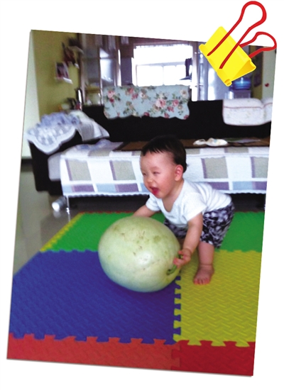家住市中区今年刚刚一岁的董富贵,最近爱上了大西瓜,虽然自己比西瓜大不了多少,但是小家伙努力地要把西瓜举起来。 (记者 张琛 摄)