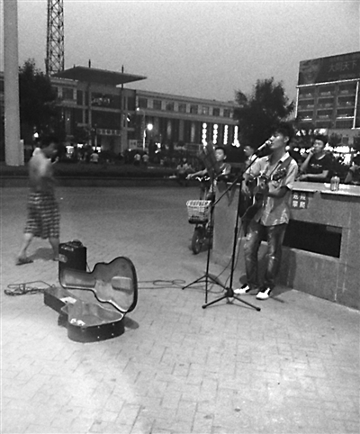 7月17日晚,滕州火车站广场一片热闹的景象,其中,一个弹着吉他的少年引来市民围观,在他的吉他箱里,零星放着市民给的零钱。这个年轻人是滕州二中的一名高二学生。“我爱好唱歌,在广场上唱歌是一种享受,在和大家分享我的歌声的同时,还能赚些外块。”乐呵呵的小孙告诉记者。