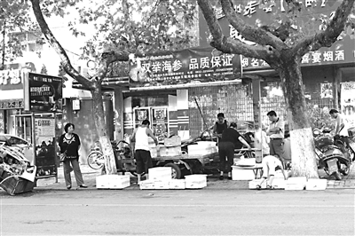 7月16日,记者经过振兴北路一个公交站点时看到,公交站台的地面上已经被摊贩摆满了各式各样的海鲜,从老远就可以闻到鱼腥味,等车的市民只好掩住口鼻。正在等车的孙女士说:“公交站根本不是摆摊的地方,有腥味不说,还给市民等车带来了许多不便。你霸着公交站台摆摊,别人还怎么等车啊?再者说,这也忒影响市容啊。”(记者 孙雪 刘一单 摄)