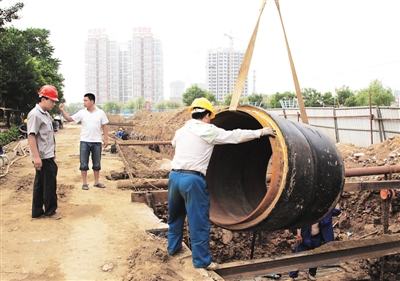 7月17日,工作人员在挥汗如雨吊装热力管线。市中区西沙河供热工程,是西部城区供热重点工程,施工难度大,又在高温期施工,工作人员克服困难科学施工,确保供暖季按期供暖。 (记者 孙明春 摄)
