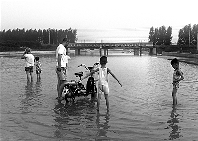 7月22日下午,记者来到市民所反映的该积水涵洞看到:由于19日、20日连日降雨,涵洞南边的沟河已经满溢,顺着低洼的地势,缓缓流入涵洞,而涵洞已经被大面积的积水所覆盖。涵洞附近有几位老人在此乘凉聊天,“这个桥洞子原来得有4米多高,现在积水最深的地方得有两米多深,这一整个夏天都这样。”一位家住石沟营村的袁姓老人告诉记者。另一位在此看守涵洞的某建筑公司工作人员介绍,涵洞原本正在施工当中,由于积水,施工只能停止,前几日也曾用机器排过水,但是雨一直在下,所以也没有什么效果。只能等过了雨季再开工。“不仅耽误施工,这水那么深,晚上很多开车的不知道情况直接淹里面了,而且你看那边那么多小孩在那玩,这水那么深,万一出了危险怎么办?”