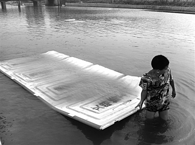 记者跟随这位工作人员,沿着涵洞边上的石阶,穿过临时被剪开的铁路防护网,穿越铁道,来到了涵洞的南边。据目测,涵洞南边地势平缓一些,不少附近的村民在积水较浅的地方洗车、玩水乘凉,几个孩子在已经漫过腰部的积水里托着一个黄色物体,玩得正起劲,“你们几个小孩,把我的警示牌都当船了是吧,赶紧都上来,把警示牌放好,别在那玩了。”工作人员大声地劝说着。