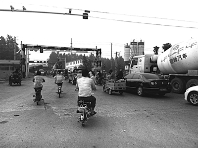 记者跟随大货车行驶了约十几分钟,来到袁老先生所说的可以通往陶庄等地的泰山南路的铁道口。由于是下午的5点多钟,属于车流量的高峰期,车辆排队等候通过道口。几位警察在此现场指挥交通,并在入口安放了路障,分流过往的车辆。