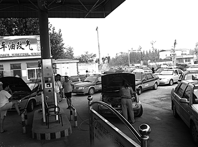 7月21日下午,在薛城区一天然气加气站,等候加气的车辆排起了“长龙”,其中多数为出租车,也有部分非营运车辆。“我每天四个小时都要浪费在加气站。”在此等了一个多小时的出租车司机张师傅介绍,这几天天热需要开空调,又经常下雨,打车的人比较多,因此天然气的需求量比以往要多一些。现在私家车 “油改气”的车辆也越来越多,因此才会出现排队加气的现象。 (记者 杨舒 摄)