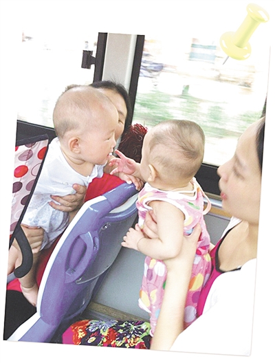 7月30日上午,两位各自带着小宝宝的年轻妈妈在公交车上,因座位邻近而聊起了天,分享彼此的育儿经,两个宝宝也嗯嗯啊啊地聊着天,十分可爱。 (记者 杨舒 摄)