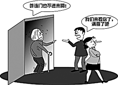 在一起赡养纠纷案中,合肥市庐阳区法院判决5子女定期看望老太太,但由于子女与老人有矛盾,根本不执行判决。而后在法官的劝导下,子女们虽然同意“回家看看”,却只在门口“看看”,连门都不进。(《江淮晨报》8月5日)