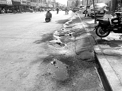 6日上午,记者在鑫昌路东段路南机动车道和人行道交界处看到有延绵数十米的污水在路边流淌,在源头处并没有发现排水口,污水是从碎裂的路面溢出的,“这下面可能是污水管道,以前路边停的全是车,估计是把路面压坏后,下面的排污管道也坏了,污水就出来了。”附近一位店主分析道。