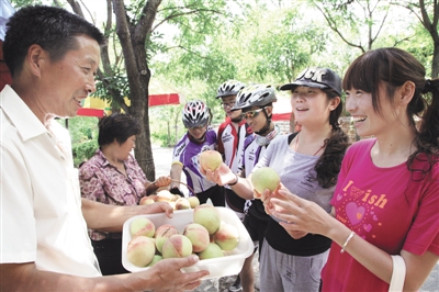 游客在熊耳山风景区开心地选购鲜桃。地产水蜜桃,以鲜亮的卖相、脆甜的口感而成为景区游客首选。 (记者 孙明春 摄)