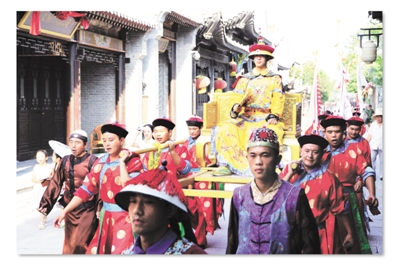 8月7日,“乾隆”坐轿游览古城。实景剧《乾隆游台儿庄》作为运河古城的经典表演品牌,已经受到中外游客的喜爱,为了丰富表演形式,还原历史风貌,将原来“乾隆”步行,改为坐轿游览,设点为游客提供与“乾隆”合影时间,并且对演员、道具、阵容进行了充实调整,更具观赏性,成了古城一景。 (记者 孙明春 摄)