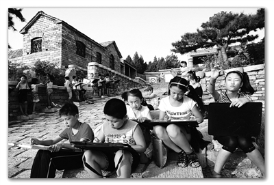 8月6日,暑期里孩子们在石板房写生。原始的自然环境,吸引了众多游客来此观光旅游,再加上韵味独具的原生态建筑,更吸引了不少绘画爱好者到这里写生。 (记者 杨军 孙明春 摄)