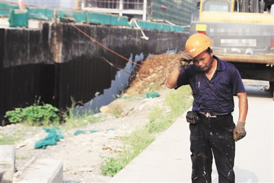 半小时后,气温上升到28℃。虽然有微风相伴,但老韩的身上却已经被汗水打湿,脱下安全帽,简单地擦拭了几下眼角的汗珠,他又开始忙活起来。此时,工地上各种机器“热闹”的混杂声更增添了一种热火朝天的氛围。