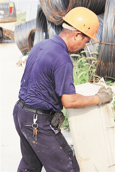 吃过早饭,工友们陆续来到工地,虽不点名,但大家都很遵守纪律。早上6:30,老韩和工友们全部到齐,大家商量好当天的分工后,便开始忙活起来。当天,老韩的任务是搬运混凝土砌成的石块。虽然没吃早饭,但一大早老韩的精神头还算不错,任务一分配下来,他也顾不得和记者交谈,便开始了一天的忙碌工作。