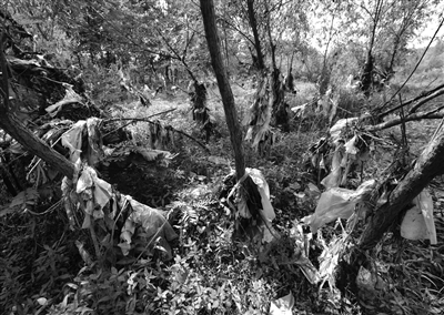今夏,我市多次遭遇强降雨袭击,农村中的一些白色垃圾随着雨水涌入河道。大水消退后,部分被河道内树木拦截的白色垃圾就挂在了树干上,成为一道让人看后很不舒服的“景观”。 (特约记者 李宗宪 摄)