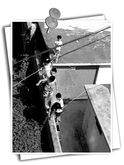 19日下午,薛城区永兴小区内的6个孩子,通过摆放在墙边的旧沙发爬上了约1.5米高的墙上,手脚并用地从宽度不到30公分的墙面通过后,登上了旁边近两米高的房顶,并在屋顶上玩耍、嬉戏。他们中最大的不过八九岁,最小的仅有两三岁,整个过程都没有家长看护。
