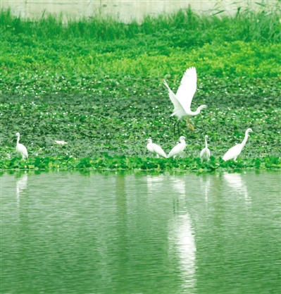 日前,一群白鹭在荆河岸边觅食。近年来,滕州市不断加强环境治理,使荆河两岸生态环境和水质不断改善,吸引了越来越多的白鹭来此安家落户,荆河两岸成了它们的栖息地。 (特约记者 侯志龙/摄)