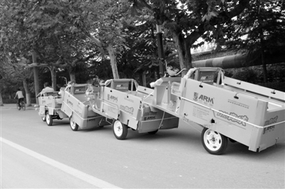 近日,在市中区解放南路,一人驾驶着电动三轮车,后面竟然拖带了3辆同款式的电动三轮车。路过的市民纷纷对这个电动三轮车队行了注目礼。