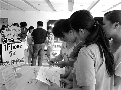 9月20日,iPhone5s和iPhone5c正式发售,枣庄市场也开始沸腾起来,相关咨询预订加速升温。20日上午,在市中区某电讯营业厅内,消费者对“苹果”的狂热度依旧,特别是金色版本的5S更加受捧。 (记者 王萍 摄)