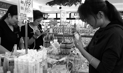 记者看到,各专柜及化妆品店里的防晒类护肤品已经“退居二线”,取而代之的是具有“补水”、“保湿”功效的各种秋冬季护肤品。一位销售员介绍说,“这两天来买护手霜、润唇膏的人挺多。而且最近乳液、精华霜等护肤品都特别好卖,天气凉了,补水保湿很重要。” (记者 刘一单 摄)