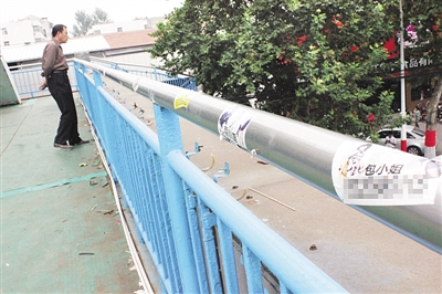 就在记者对着栏杆拍照的时候,一位路过的市民宋先生说:“看样子,这样的广告贴了有一段时间了。看到这些广告浑身不舒服,解放中路的人流量这么大,这些广告贴得这么显眼实在是有伤风化,真得好好管一管。这种小广告竟然堂而皇之地张贴在天桥上,污人耳目,损害市容市貌。”