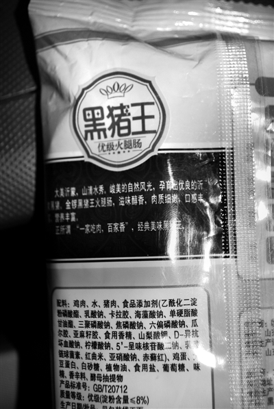14日上午,记者来到市中区君山路上的一家大型超市内,在肉肠类专柜前记者发现了许多不同种类的火腿肠。记者随手拿起一袋写着“黑猪王”的火腿肠,在包装袋后面的配料表中记者发现这款名为“黑猪王”的火腿肠中竟然包含鸡肉的成分,不过上面也没有标注鸡肉与猪肉的比例。