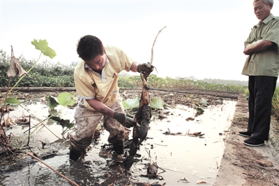 昨日,税郭镇牛角村一种植户正在收获池田藕。