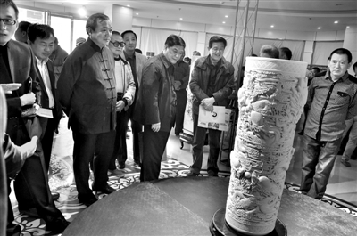 近日,枣庄首届景德镇书画陶瓷艺术交流会开幕,活动邀请了国内知名的艺术大师和枣庄的书法家、画家在瓷片上现场泼墨,展现了枣庄书画和景德镇陶瓷巧妙融合的艺术魅力。“古老的大运河,催生出枣庄‘江北水乡、运河古城’的美誉,而景德镇瓷器集工艺、书法、绘画等于一体,是传播中国文化的符号和载体。这次活动将两者通过书画融为一体,可谓意义深远。”主办方一位负责人介绍道。 (记者 焦兴田 摄)