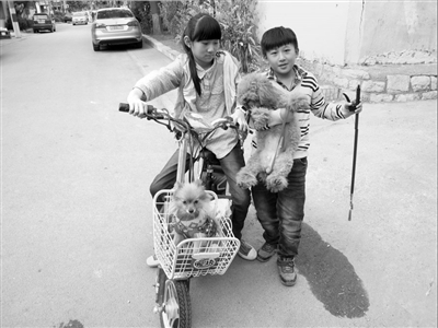 日前,市中区振兴东里,一名小男孩和他的表姐或牵或抱着5只宠物狗在遛弯儿。男孩说:“他们都是我的宝贝,它叫博美,它叫泰迪,还有京巴!” (特约记者 张敬宇 摄)