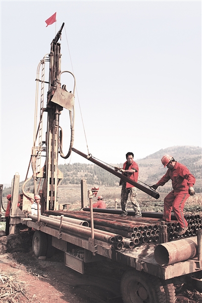 10月26日,工程人员在安装管线。为了解决小流域的村民用水问题,山东省水利工程总公司的钻探工程人员,来到山亭区凫城镇田庄村钻探打出深水井3眼,并配套建设了大口蓄水池,解决了村民饮水、浇地用水难题。