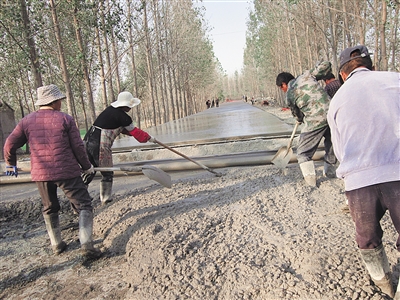 26日,工人正在市中区税郭镇纪官庄村主干道修筑水泥路。近期,税郭镇筹资20余万元,对该镇纪官庄村至206国道之间的600余米道路实施水泥道路硬化工程,解决了该村群众出行难的问题,许多村民自发前来修路,“连心路”几天时间就修好了。