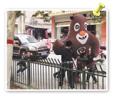“熊大来了!”日前,卡通片《熊出没》中光头强的“小伙伴”熊大走到了大街上,小朋友们一拥而上,你摸一下,他掐一下,实在承受不了“万千宠爱”的熊大连忙逃跑,可最终还是没“逃过”众多小朋友的围攻。