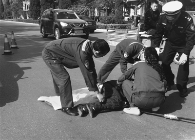 近日,在滕州学院路与科圣路交会处,一位老人在马路中央不慎摔倒,不能动弹。危急时刻,好心人帮忙拨打120,路过的交警二中队崔警官停下车设置了路障,120救护车也赶到现场。在众人帮助下,老人逐渐恢复清醒。 (记者 姚付林 摄)