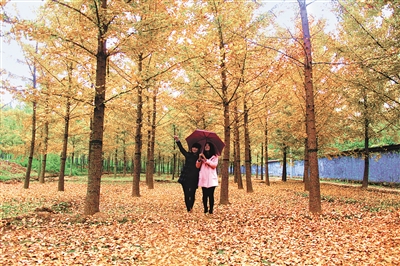 昨日,两位市民打着伞在银杏林中欣赏秋景。当日蒙蒙的细雨让滕州市俞寨居的银杏林层林尽染、秋色满园,遍地金黄的独特秋景吸引了众多市民前来观赏。