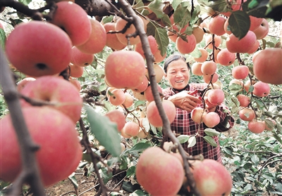 10月30日,山亭区九老庄村农民赵延风在自家果园内采摘苹果。眼下正是山亭区1万多亩山地苹果丰收的季节,果农们正忙着将苹果采收装箱,准备出售。近年来,山亭区农民因地制宜,在山坡上种植优质红富士苹果,取得了良好的经济效益。