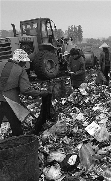 沿着此处再往前走,便到了刚才看到的那个大平台,靠近大坑的边缘位置堆积着较多的垃圾,十多名背着竹筐的男男女女正在垃圾丛中“淘宝”,有些青壮年为了寻找到更有价值的垃圾,更不惜冒险站到极靠近大坑边缘的地方,用手里的钩子将垃圾勾起。