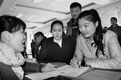 11月12日,在台儿庄区人力资源市场,工作人员指导高校毕业生填写用工登记表。当日,台儿庄区在人力资源市场举办了2013年高校毕业生专场招聘会。来自省内外的50多家企业提供了管理、普工和专业技术等类别的岗位4000多个,1000余名求职者进场参加招聘,800余人初步达成了就业意向。(特约记者 张严新 通讯员 刘光辉 摄)
