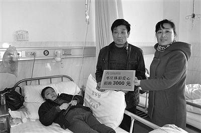 晚报讯 (记者 田思立 通讯员 张洁 摄影报道)11月18日上午,市立医院血液科7楼病房里,徐旭一家接过了由枣庄市体彩中心送来的3000元爱心善款。