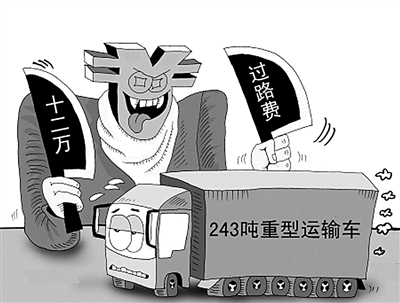 普通轿车、货车走高速路,每次只需缴几十元过路费。如果一辆车一次缴纳12万元过路费,那是什么概念?12月9日,一辆243吨的重型运输车从铜川出发,经包茂高速,到达陕西省高速公路陕蒙界收费站,500公里竟缴纳了122690元过路费。(《华商报》12月11日)