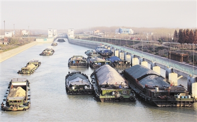 11日,满载货物的船舶通过京杭运河台儿庄船闸。日前,水运升温,京杭运河台儿庄船闸、复线船闸管理部门对途经的货物运输船队实行24小时不间断放行,确保不发生滞留现象。