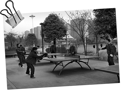 随着一股冷空气来袭,气温骤降,虽然连日雾霾不散,但市民晨练热情不减。昨日清晨,在东湖公园内,一些市民在打兵乓球,还有些市民跑步锻炼。 (记者 李帅 摄)