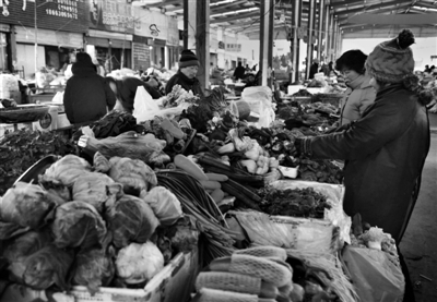 12月23日,市民在龙头市场选购蔬菜。入冬后,本地产蔬菜价格平稳,辣椒、西红柿、豆角、黄瓜等价格稳定在每斤2元左右,大白菜每斤在0.30元,由于蔬菜品种齐全,市民从容消费。