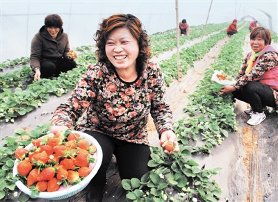 1月3日,果农在快乐地采摘草莓。被誉为枣庄“冬天第一鲜”的草莓新鲜上市,由山亭区凫城镇千佛崖村柴培玲栽植的30多亩“瑞丰铁将军”大棚草莓,由于草莓个大、耐存、沙口、色彩鲜亮,受到消费者喜爱。 (记者 孙明春 王震 摄)