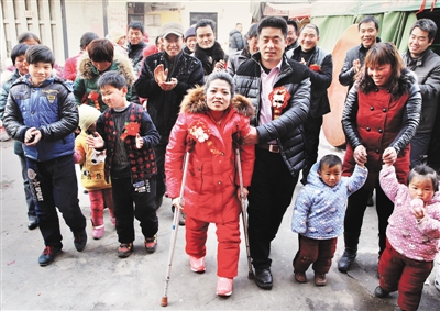 1月2日,在亲朋好友的见证下,跪行了27年的农村女孩谢丽,在社会各界爱心人士的关爱下,奇迹般地站了起来,拄着双拐和新郎携手走进了幸福的婚姻殿堂。