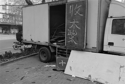5日,在市中区龙头东路市体育馆南门附近,一辆写有“收木柴”字样的厢式货车霸占了大半个人行道,车厢内已经堆满了各种各样的废弃木柴。据周围的市民告诉记者,该车的所有者应该是货车旁边的羊汤馆,该车在此处停放也有几天的时间了。 (记者 王龙飞 摄)