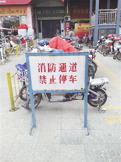 1月7日,在市中区八大批发市场门口,一个写着“消防通道 禁止停车”的警示牌后面却停满了电动车和自行车。面对牢牢占据消防通道的“车队”,让人不禁问一句:“消防车真的能通过吗?” (记者 孙雪 摄)