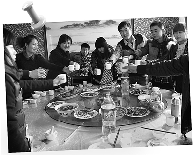 大家把雪碧倒入杯中,美其名曰“白酒”,不喝雪碧的倒上些可乐,戏称这是“黑啤”。年纪最长的赵先生首先举杯:“今天是车友聚会的日子,大家以雪碧代酒,祝在座的各位车行万里平安归。”这句话可说到了大家的心坎上,车友们站起来一起碰杯,“来,让我们一起平平安安迎新年。”