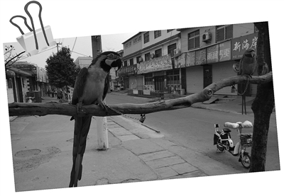 近日,在薛城区燕山小区附近,两只鹦鹉被主人用一链锁锁在一树干上,其中一只鹦鹉绿头白脸,尾巴长达近30厘米,十分漂亮。看到有陌生人靠近,两只鹦鹉也不害怕。据周围的居民介绍,这两只鹦鹉在此处也有段时间了,大家平时没事儿就喜欢逗它们玩,给大家带来了不少欢乐。 (记者 王龙飞 摄)