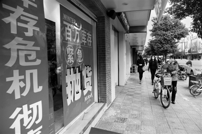 春节临近,节前商战拉开序幕,商家们纷纷拿出“甩卖”、“换季放血”、“抛货”等销售策略,以此来吸引消费者眼球。图为吉品街的一家商铺打出“百万库存 紧急抛货”的广告。