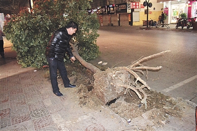1月14日,记者在吉品街看到,路沿石上的绿化树倾倒在路边,无人问津,旁边店铺的工作人员说,“我们一早来上班时绿化树就这样了,听早上打扫卫生的环卫工说,昨晚有车撞到了路沿石上的座椅和绿化树,一大早车便被拖走了,但绿化树却没人清理。”