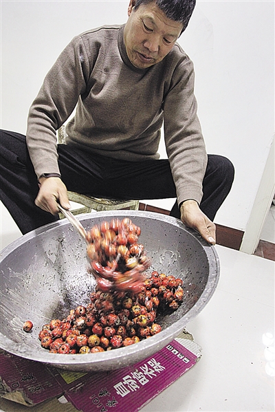 制作雪红果也是杨其全的拿手绝活。每天早上5点钟,他就爬起床来,手工制作几十斤的雪红果,带到市场卖,他说,虽然雪红果制作比较麻烦技术含量高,但产品全了才能吸引更多的消费者前来。