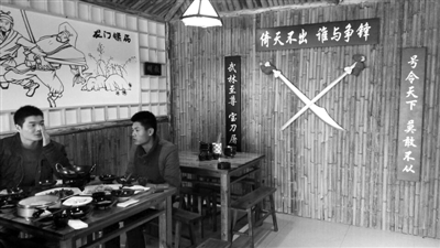 走进店内,小二们会齐声喊道“幸会幸会,里面请!”环顾店内四周,无论是门脸上的横匾,还是每个隔间的设计,颇像电影中古代酒肆的样子:刀、枪、棍、棒、剑、戟……隔间内都会挂着上述武器,隔间的命名也颇有一番“侠气”,古墓派、丐帮、峨眉派、武当、东邪、西毒……这些只出现在金庸老先生笔下的概念跃然眼前,用餐者就可以根据自己的喜好任意挑选帮派。这边刚坐定,那边小二便会殷勤地为你倒好功夫茶,随后一位名叫“黄蓉”的女子便“奉上”一本《武林秘籍》,其实就是菜谱,化骨绵掌—红枣银耳蒸南瓜,大力丸—糯米圆子,紫霞神功—茄子炒油条,缩骨大法—粉蒸排骨,降龙十八掌—椒盐猪手。